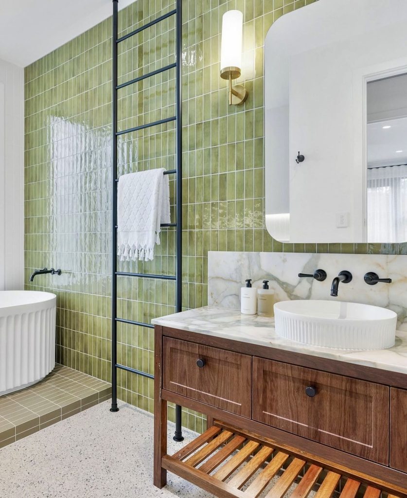 A breath of fresh air, this bathroom combines light olive tiles with warm wooden tones for a soft, sunlit effect. The ribbed bathtub and open vanity shelving add depth and character, emphasizing comfort and functionality. Black and gold accents—seen in the ladder towel rack and wall light—create the perfect balance between industrial and elegant. The overall design feels grounded yet playful, inviting a calm start to the day. This decor captures the easy warmth of natural materials paired with refined modern style.