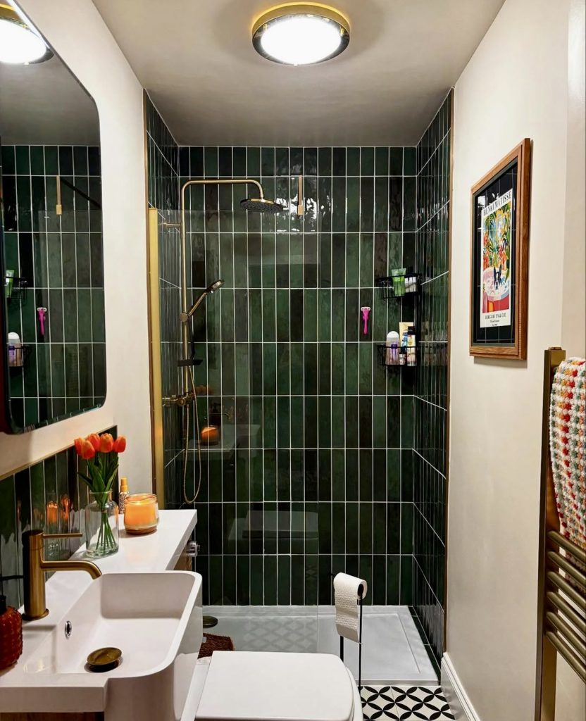 The vertical rhythm created by narrow emerald tiles on the shower adds visual height to the space. The embossed emerald tiles contrast beautifully with the gold-and-white fixtures and add a contemporary touch to the classic design. The candle and tulips add cozy warmth to the clean geometry. The black-and-white patterned tiles nod to the retro design. The bathroom beautifully balances moody richness and welcoming charm.