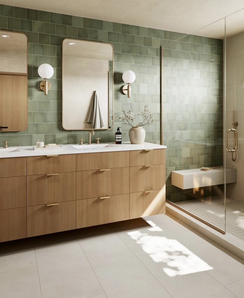 The bathroom contains light sage square tiles and oak cabinetry with cream and beige tones. The bathroom fixtures and the double mirrors create a sense of symmetry, and the design is complete with gold framing. The warm light of the wooden cabinetry is enhanced as it reflects off the walls. The design is a soothing composition, and the calm, spa-like interiors are anticipated for 2026. The design beautifully reflects timeless serenity with simplicity and the organic textures.