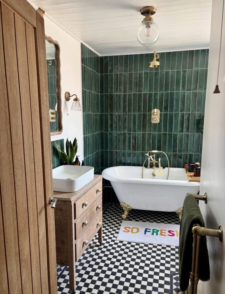 This cheerful green and white bathroom celebrates nostalgia with its retro charm and modern flair. Vertical seafoam tiles add height and depth, while checkered flooring brings in a playful, vintage pattern. The brown and brass accents on the fixtures create a cozy, collected look that feels lived-in and inviting. A freestanding tub with gold feet adds an instant focal point, exuding timeless elegance. Altogether, this space proves that green bathroom ideas can balance old-world beauty with fresh, modern energy.