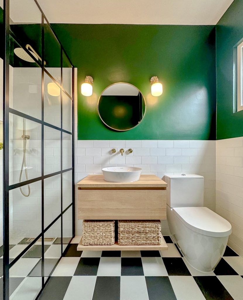 This modern bathroom captures attention with its forest green walls contrasted against bright white tiles and sleek black framing. The clean grid shower enclosure gives a graphic, architectural look, while the checkered floor adds a retro edge. The floating wood vanity with woven baskets introduces warmth and natural texture to the crisp palette. Gold and white accents in lighting and fixtures balance the space with elegance. This design proves that bold color blocking can feel both daring and timeless when paired with minimalist forms.