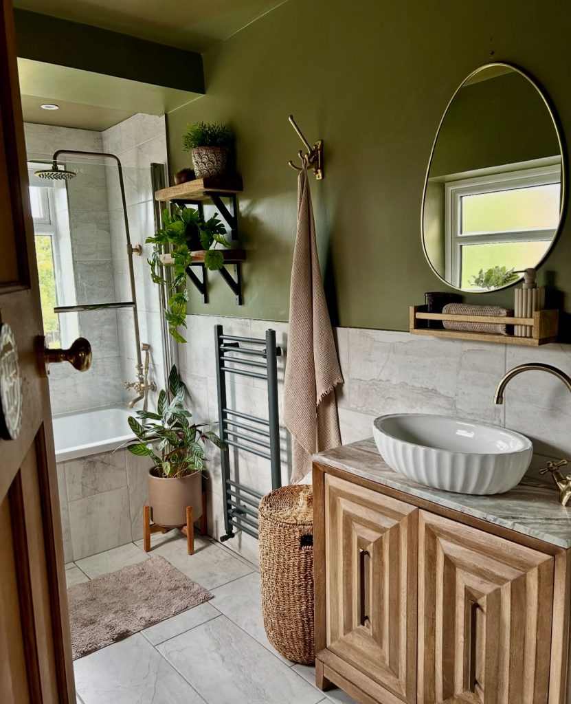 Embracing olive tones, this bathroom feels organic and deeply calming. The combination of soft green walls and light stone walls creates an earthy harmony, while wooden cabinetry and woven accents add warmth and texture. Small touches of beige and brown decor, like baskets and shelving, keep the palette grounded. A sculptural white basin and brushed brass fixtures lend a refined, artisanal charm. This design embodies the natural luxury trend predicted to dominate bathroom ideas in 2026.