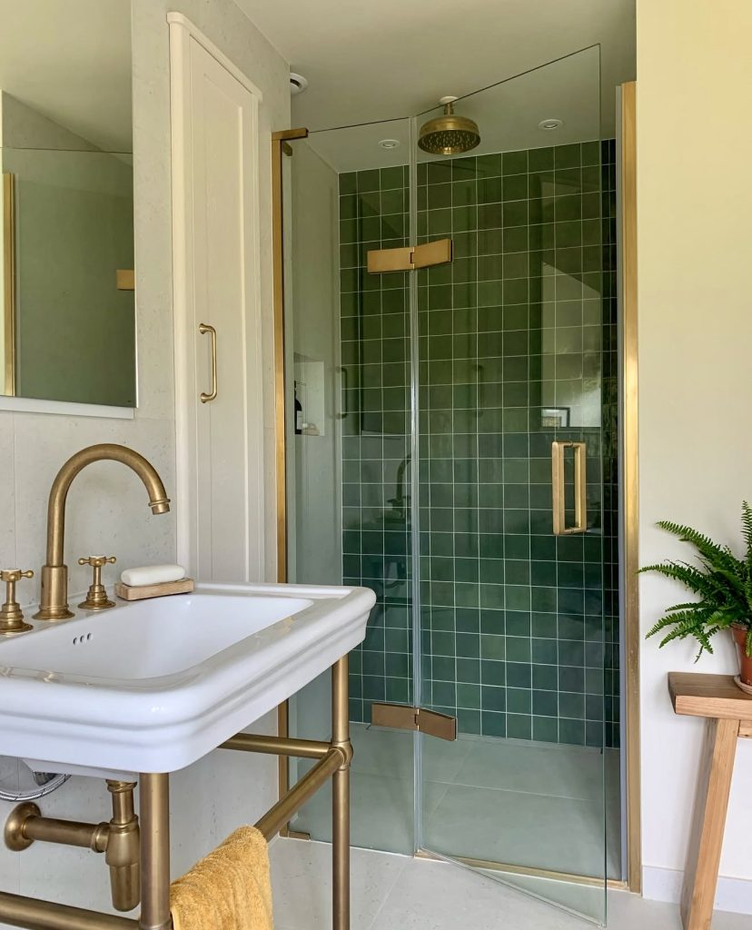Delicate light sage tiles define this bathroom’s peaceful identity, paired with cream and gold details that create a soft, luminous effect. The compact shower framed in brass feels modern and airy, giving a luxurious spa-like vibe. The porcelain sink and vintage-style fixtures bridge classic and modern design seamlessly. A small fern plant adds a touch of organic life to the space. It’s a masterclass in how subtle tones can make a bathroom feel both elegant and inviting.