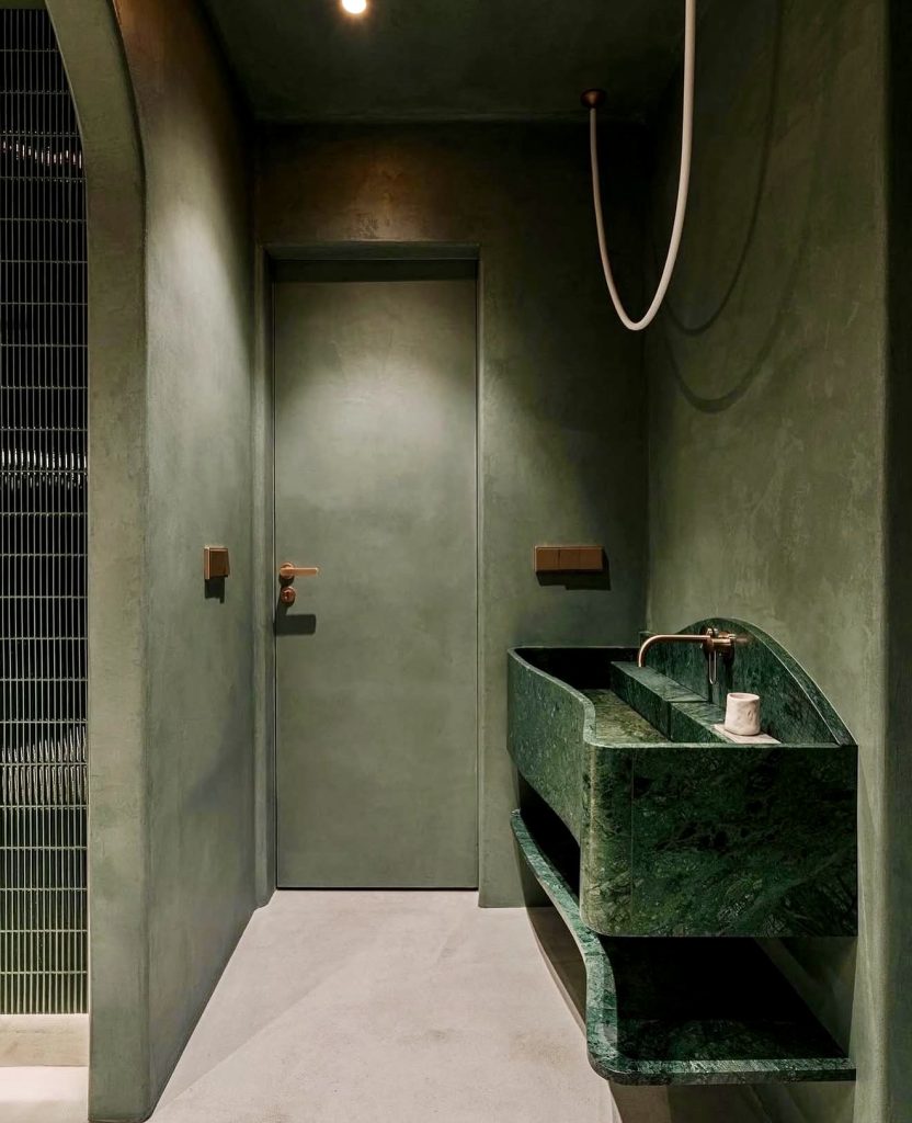 The bold sculptural sea green vanity modernizes the bathroom. The marble finish gives the vanity a strong presence. The smooth plastered walls imitate the vanity and make for a seamless look and high-end monolithic design. The copper fixtures balance the dark palette and warmth of the cold silence. Rounded shapes soften the harsh minimalism and provide artistry. The design is a statement piece of modern architecture—simply sensual and deeply aesthetic.