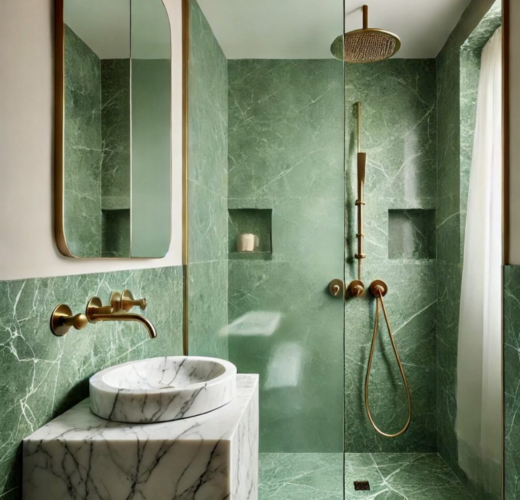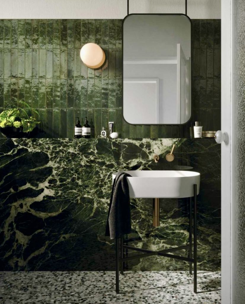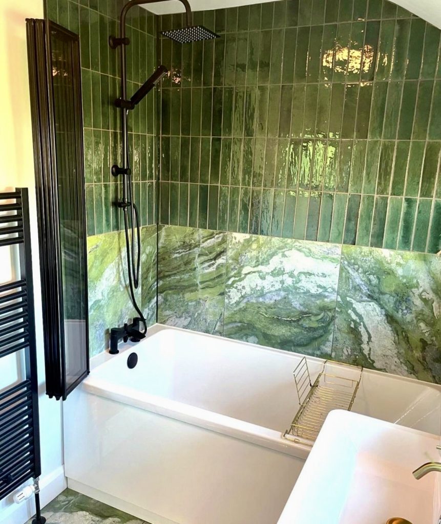 Here, glossy emerald tiles meet textured green marble for a dramatic yet balanced look inspired by nature. The layered tones of seafoam and forest add visual movement, giving the bathroom an almost sculptural presence. Matte black fixtures and a deep white tub ground the space in modern contrast. This moody combination of materials speaks to the growing love for earthy luxury in contemporary decor. The overall feel is both indulgent and organic—perfect for those seeking bold, biophilic serenity.