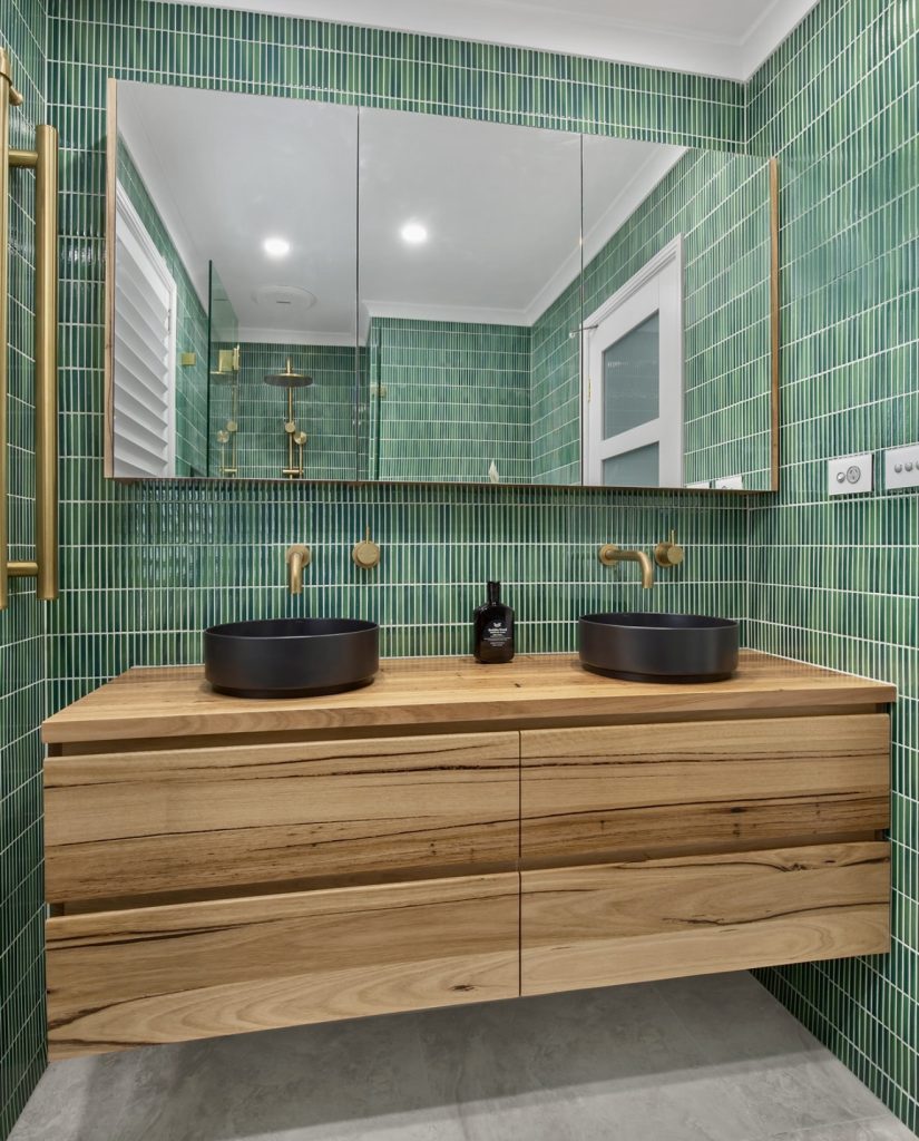 This vibrant mint bathroom uses slim vertical tiles to elongate the space while adding a playful rhythm to the walls. Natural wood cabinetry with clean lines softens the modern grid, creating a warm, balanced design. The double matte-black basins and brushed gold accents give a chic, contemporary finish. It’s a striking take on green bathroom ideas that feels urban yet inviting. Perfect for city dwellers seeking a touch of nature without sacrificing style.