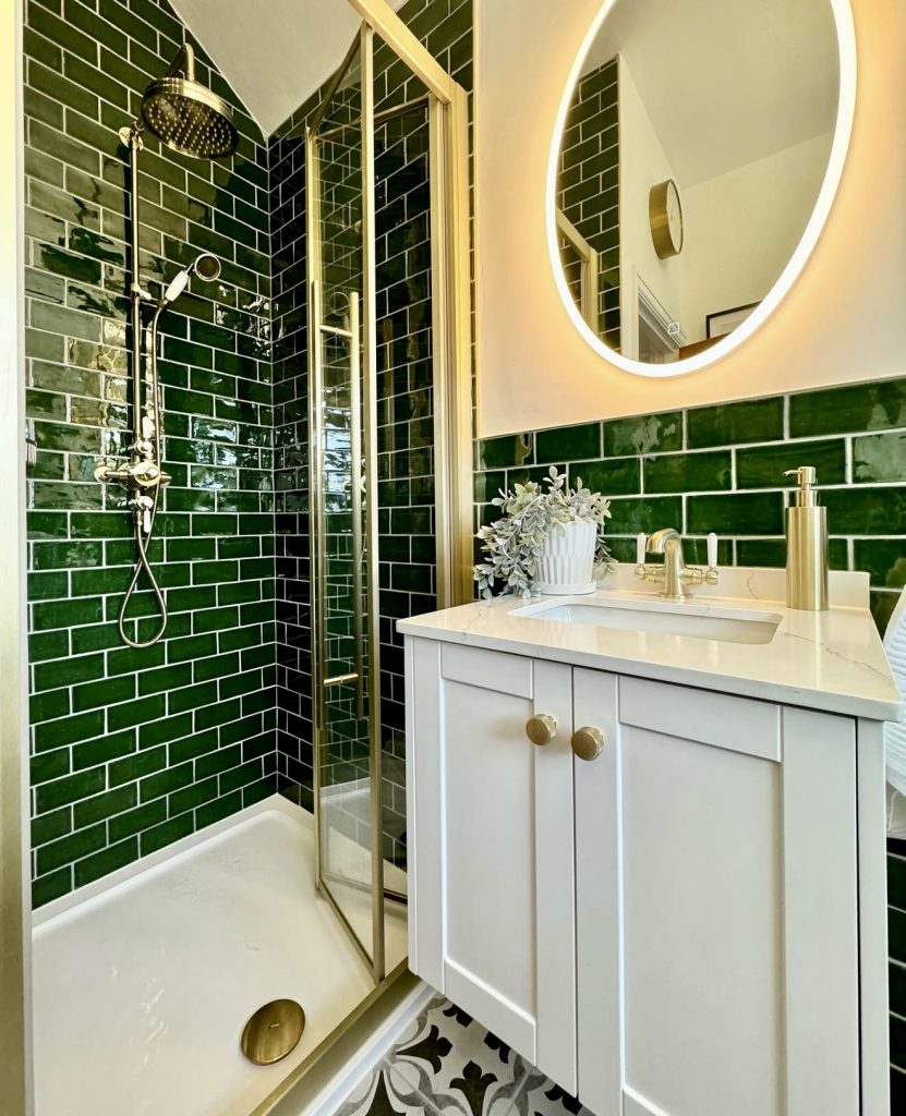 Glossy dark green subway tiles paired with white and gold details give this bathroom a luxurious, retro appeal. The spaciousness is drawn out by the illuminated mirror, while the patterned flooring brings in a touch of character. The compact shower setup is also the proud owner of an elegant shower space with a golden frame and fittings. The interplay of contrasting reflective tiles with matte tiles breaks the monotony while preserving the pristine uniformity of the space. The aesthetic seamlessly integrates old Hollywood looks with contemporary comfort.
