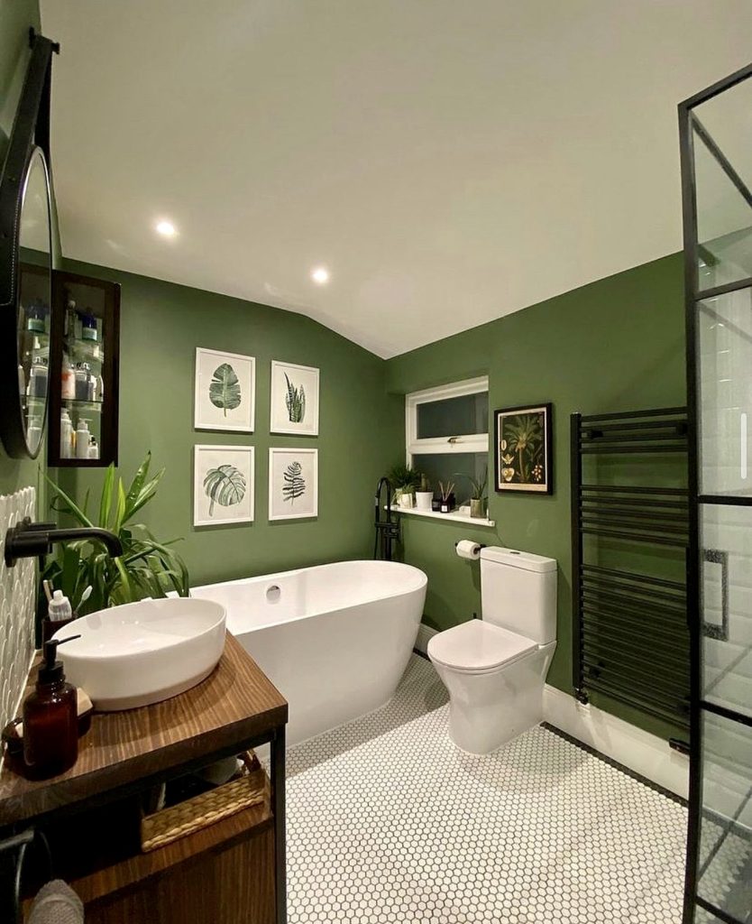 Soothing olive green walls give this bathroom a calm, nature-inspired feeling that is further complemented by botanical prints and potted plants. The mix of matte black details and white and tile flooring balances the retro and contemporary aesthetics. The freestanding tub and minimal vanity enhance the open, airy layout that is trending in 2026. The warm wood textures bring comfort and echo the eco-friendly designs from modern home blogs like House Beautiful. This inviting take on everyday luxury is the result of modern, subtle color and textured contrasts.