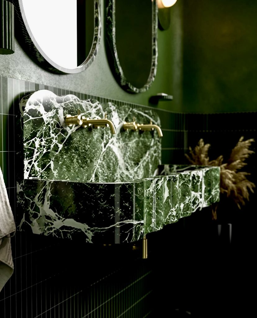 Here, luxury meets art through a breathtaking forest green marble sink with strong veining that feels sculptural and dramatic. The dark surfaces and brushed gold faucets highlight the stone’s natural movement, creating a true statement aesthetic. This bathroom embodies confidence, a bold twist on the traditional mint or sage hues often seen in softer settings. The rich contrast and sleek silhouettes make it both timeless and avant-garde. It’s a daring example of 2026 designs that merge craftsmanship with personality.