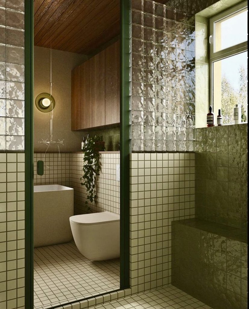 Soft seafoam and muted beige and green tiles make this small bathroom a sanctuary of warmth and subtlety. The square tiles, paired with wooden ceiling accents, channel retro charm in a completely modern form. Transparent glass and light finishes invite natural brightness, proving that compact spaces can still feel spacious and refined. The combination of glossy and matte textures reflects an emerging 2026 trend toward tactile minimalism. Perfect for those who prefer understated decor that whispers serenity instead of shouting it.