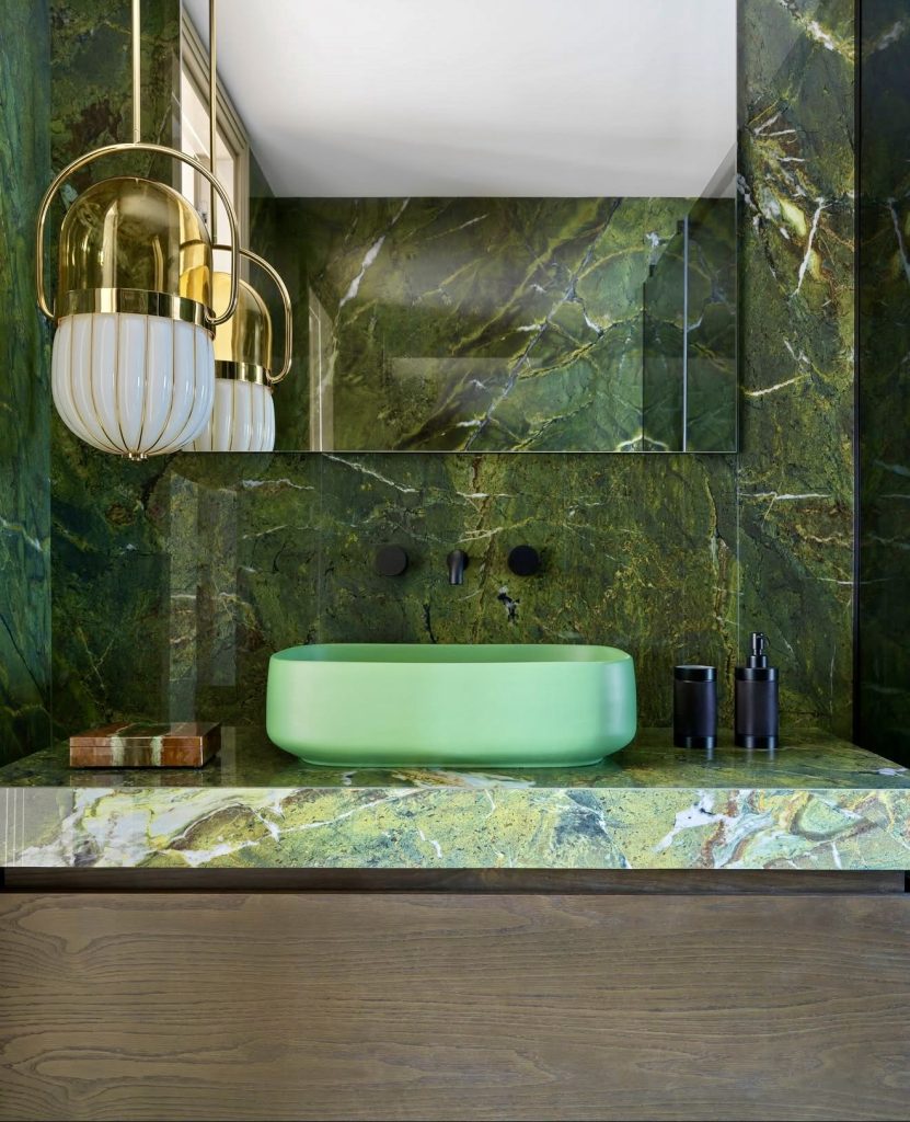 The marble with rich, deep green hues showcases the vibrance of its elements. The deep green stone shows a lovely contrast of lighter green marbles mixed in with interesting designs. The contrast basin of sculptural marble in soft green balances the contrast of textures and creates modern marbled art. The design is modern with high-end-styled lighting along with big mirrors that provide a modern, luxurious feeling. The wooden cabinetry adds warmth and provides a grounding element to the cohesive look. This evokes a feeling of modern artistry reminiscent of a luxurious spa retreat.