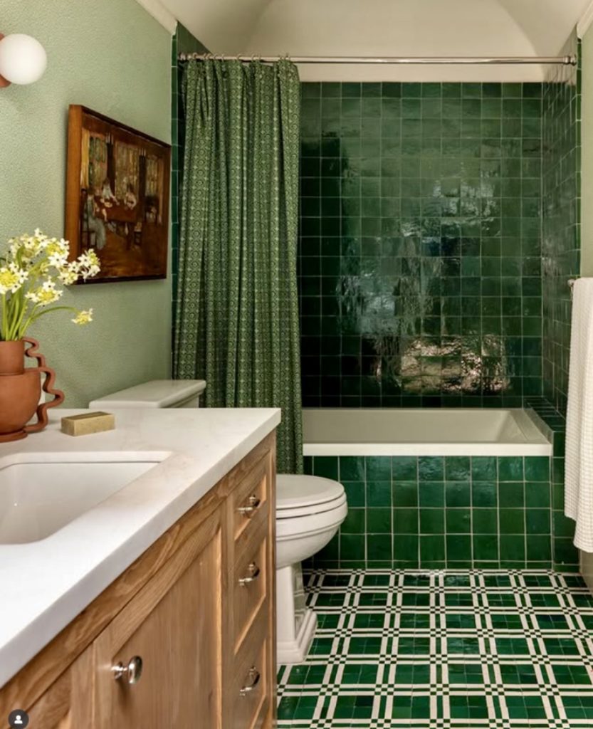 This olive- and forest-toned bathroom is charming, encapsulating a refreshingly modern and nostalgic retro style. Glossy green tiles embrace the shower area with a cozy and vibrant wrapping, and the rhythmic appeal of the patterned floors extends the design. The brown and cream vanity fosters a homely touch, mid-century inspiration, and warmth in the space. Thoughtful touches of decor, from terracotta planters to framed art, created a collected atmosphere of personality. Timeless style often stems from heartfelt details, and this provides the perfect reminder.