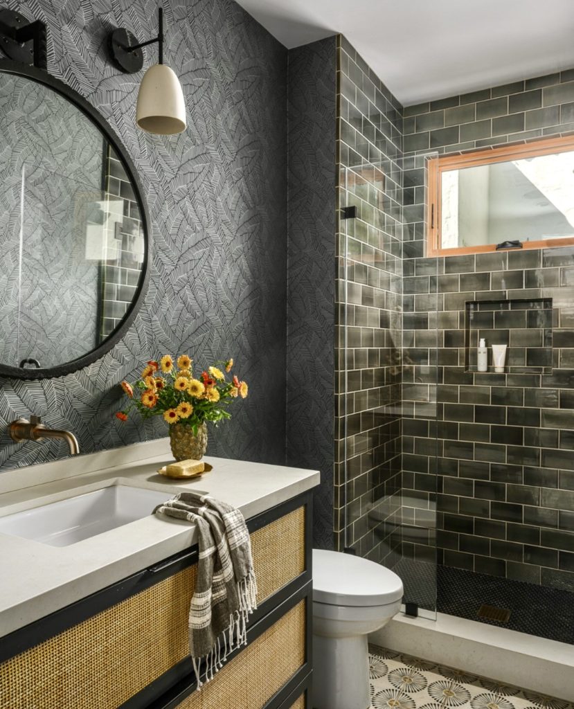 This looks for individuals who need a guest bathroomthat’s dramatic, fun, and unforgettable. Dark green tile with graphic floor tile creates a moody, texturally rich landscape. The cane detail combined with the black-edged vanity achieves a perfect balance between modern and natural styles. Patterned wallpaper carries it out, making the room heavy with texture and bold with personality. It’s a statement-giving guest bath that fits wonderfully in 2026’s design-conscious homes, demonstrating that the smallest of all realms may yet create luxury.