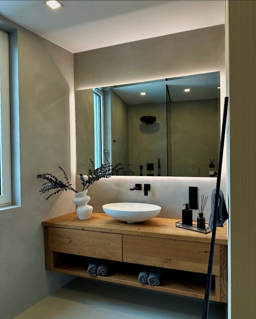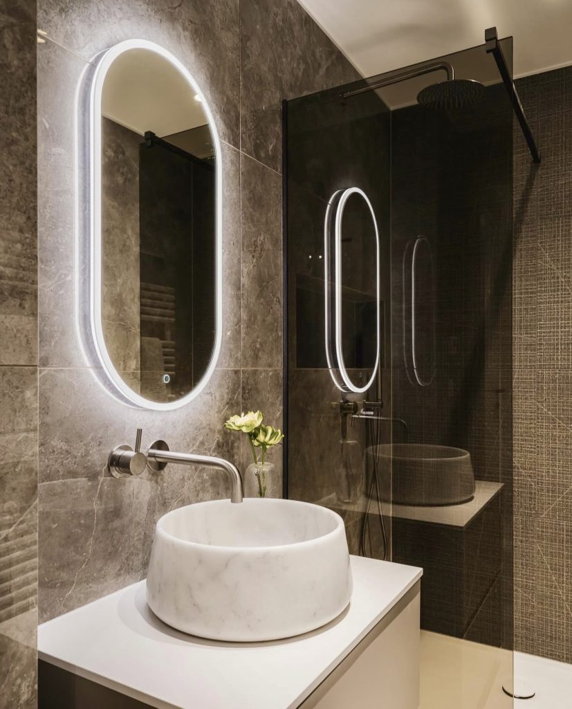 This bathroom features a moody, high-end look with dark stone tile and a backlit mirror that feels high-tech. Compact yet high-end, a round marble sink offers a luxury note with a combination of natural texture with modern, sleek lines. It’s a bright idea for a miniscule guest bath that still wants a spa feeling. Black lighting keeps it sophisticated and modern, but fresh flowers add a personal, fluffy note that softens it a bit. It’s a classic look that feels both private and high-end in 2026.