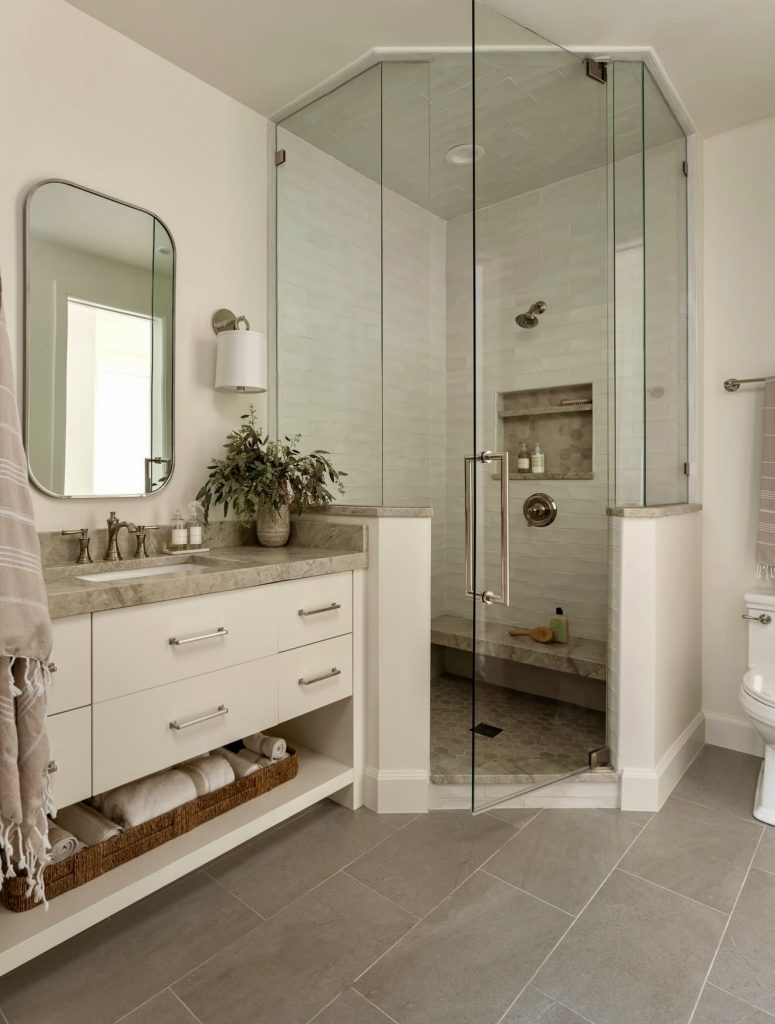 Here, a corner glass shower with stone details offers a luxury yet sensible solution for a guest bath. With a double vanity in a light neutral finish, this configuration feels fresh as well as inviting, balancing out with a spacious layout. A pop of green life adds vitality to this decor, mellowing out rough surfaces. This design goes for a classic, elegant, modern style with a subtle texture mix. It’s a great idea for homeowners who want their guest bath to be spacious while still being fully functional and charming.