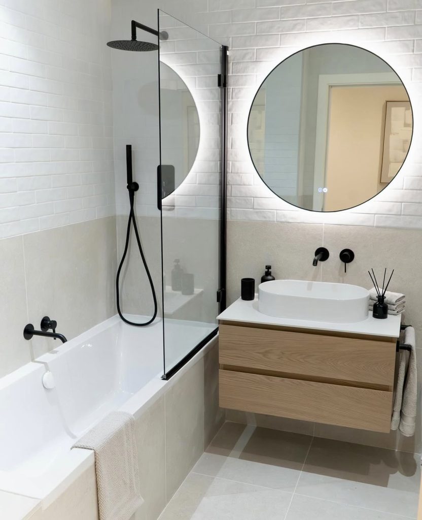 This guest bath showcases a showstopper of a shower tub combo, ideal for compact areas or an apartment. With a black as well as white contrast, this configuration feels modern as well as sleek, with a round mirror adding a soft, lively pop. With light wood floating cabinetry, this room remains open-feeling but remains useful. With backlit elements, this feels like a subtle luxury ambiance that feels spa-like at its best. It’s a brilliant, classy choice for homeowners that want style but not at a loss for functionality.