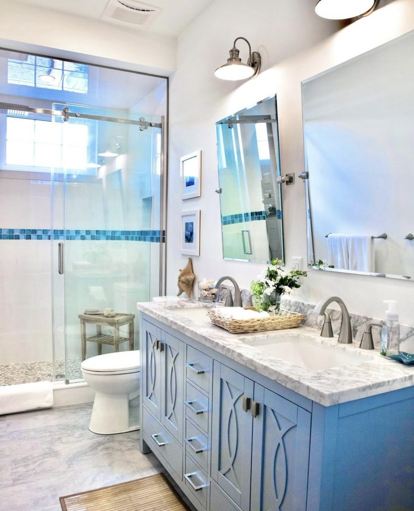 With soft blue cabinetry, this guest bath instantly feels cute as well as adorable, notably with a whole double vanity. With a practical but fashionable shower layout, this room remains useful yet trendy, with patterned stoneware flooring adding subtle interest. With a lot of light bouncing off mirrors, this room really feels fresh as well as classic coastal at its finest. With marble countertops, it goes for a classic, classy, modern style yet remains inviting. It’s a great idea for families or shared child spaces that require durability but lots of charisma.