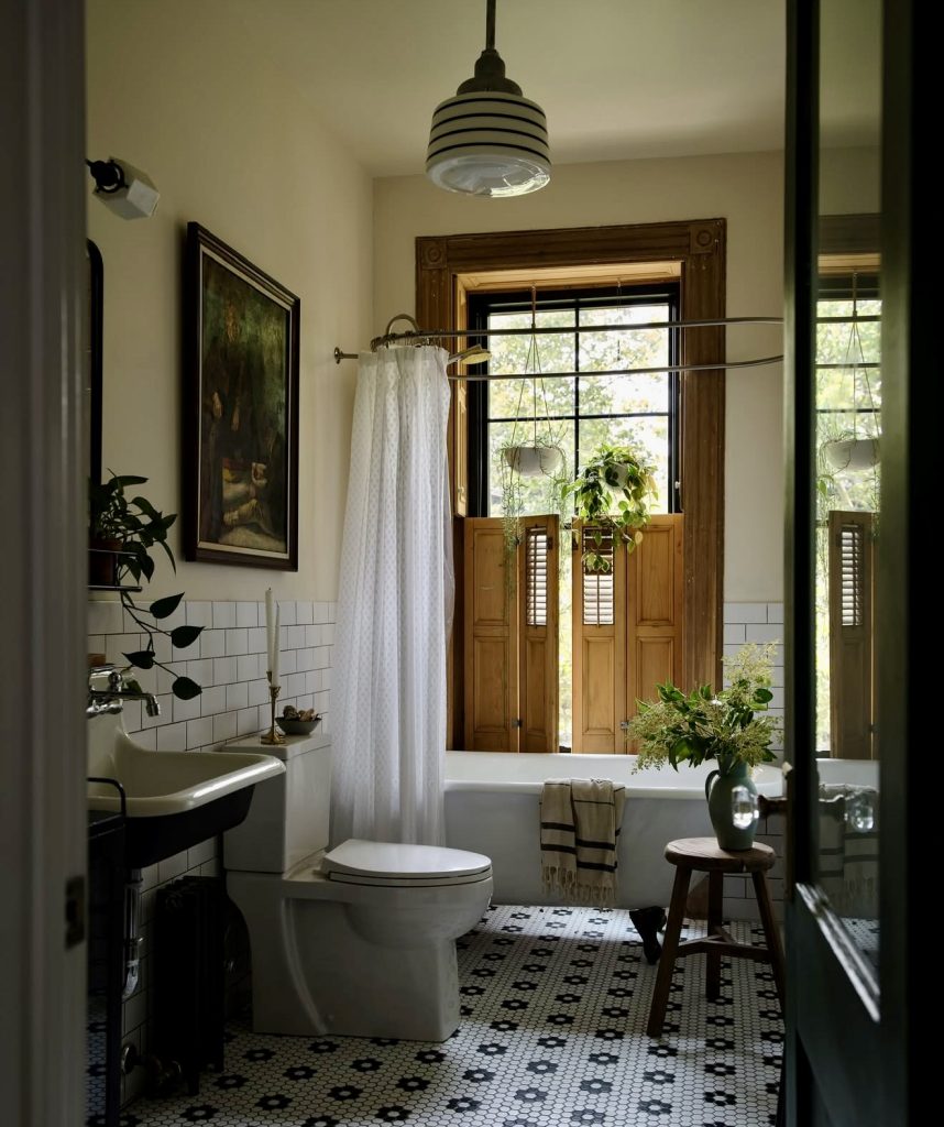 This design demonstrates how a classic look can look just as fresh in 2026. Traditional black and white patterned flooring establishes a retro mood, but wood shutters add a nice, warm, characteristic touch. A with tub arrangement keeps it versatile, suitable for visiting or shared children’s use. Greenery elements and rustic touches emphasize decorations, introducing a natural softness to the otherwise dramatic appearance. It’s a lovely demonstration of a small bathroom being filled with flair yet still sophisticated.