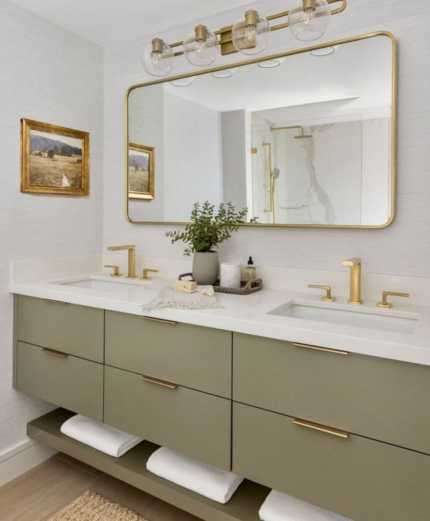 This guest bath pairs a pale green double vanity with matte black fixtures for a stylish combination of modern sophistication and functionality. The expansive mirror reflects light wonderfully, making it look light-filled and full. Clean-lined storage and concealed storage maintain a sleek look while also giving it a warm, inviting ambiance. Greenery and artwork add a note of decor that individualizes and stylizes the bathroom. It’s a classic look that would seamlessly belong in both large homes and apartment homes in 2026.