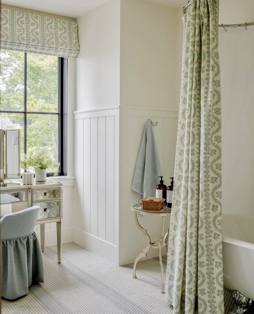 This look celebrates classic charm with muted hues, patterned drapes, and a comforting tub configuration. A skirted stool over a mirrored vanity adds a note of cute charm, ideal for making a big impression with pampering upon a guest. White beadboard paneling with soft flooring provides a blank canvas that’s both neutral and inviting. The configuration demonstrates that a small bath may look quaint yet not overwhelm the senses. This is a guest bath that mingles classic with delicate, sophisticated elements.