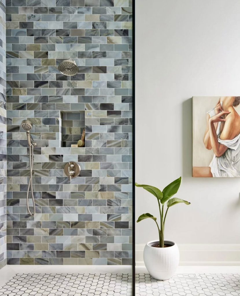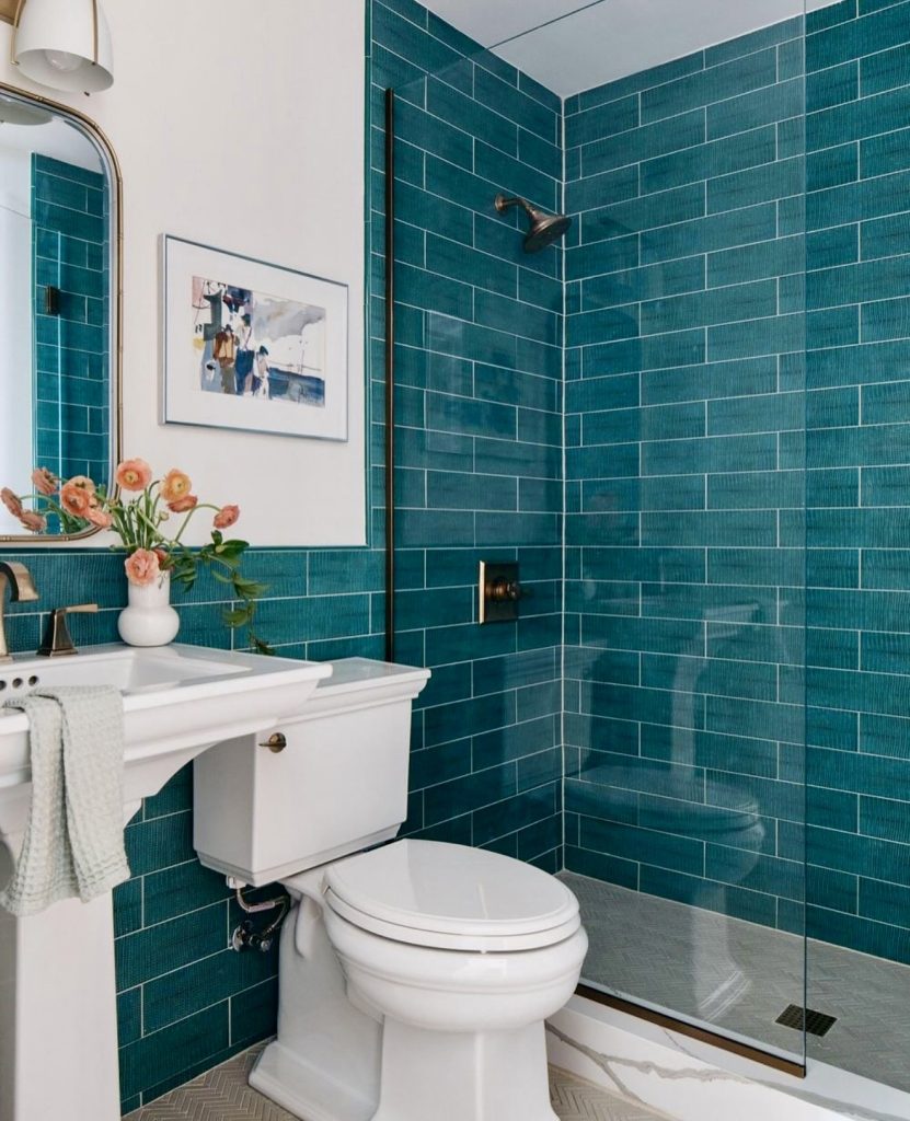 Blue-hued tiles give this shower wall a fresh, modern, instantly peaceful look. Coupled with a white floor with minimalist decor, it results in a room that appears at once classic yet fun. Warmth, as well as personality, comes with this plant as well as artwork, tempering bold tiling. This look, being versatile, will work with a large home or apartment, demonstrating that colors may change the smallest rooms. It’s a sensible, sophisticated look that has a hint of coastal spa.