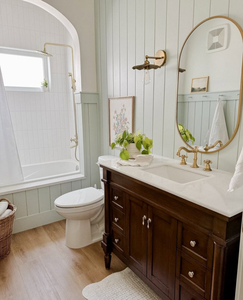 This bathroom pairs a rich wood vanity with soft green wall paneling for a timeless and inviting style. The with tub layout ensures versatility, making it perfect for a shared kids’ space or a compact apartment. Brass fixtures and an arched shower frame introduce elegant modern charm while maintaining warmth. A touch of greenery adds freshness to the decor, tying the natural tones together. This design balances cute details with classic sophistication, ideal for 2026 bathrooms.