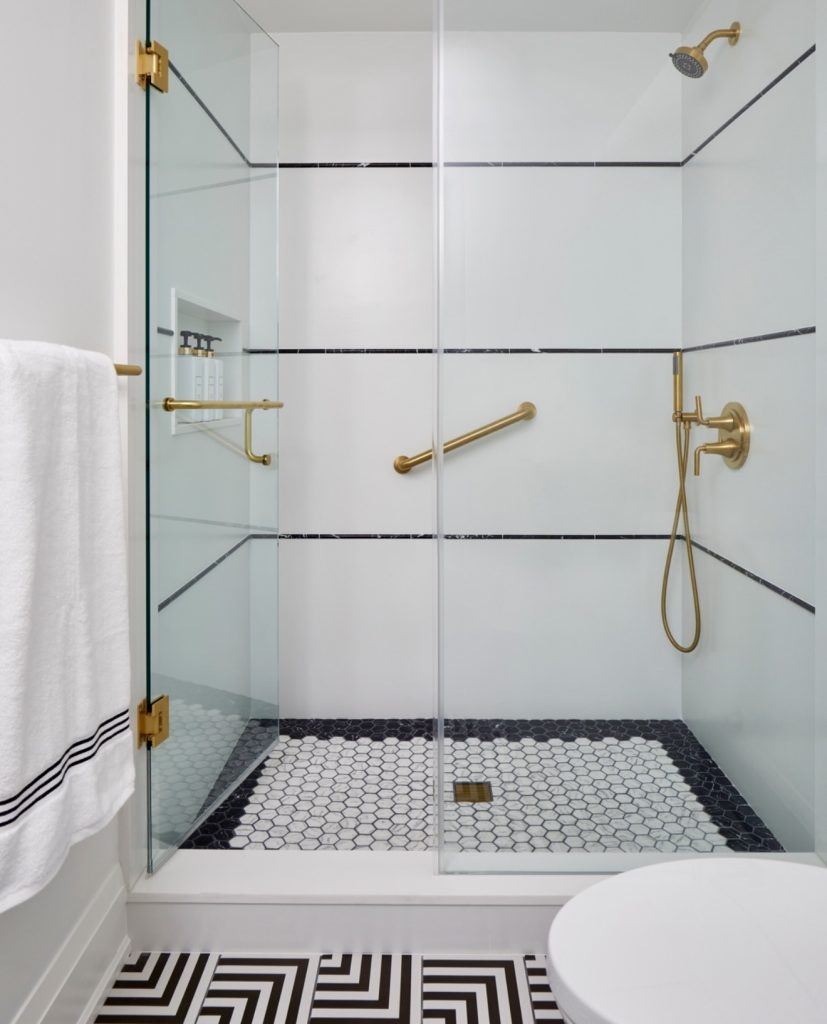 Here, a striking black and white scheme makes the shower a bold focal point. The geometric flooring and honeycomb tiles add fun personality while staying structured and stylish. Gold fixtures lift the look with a hint of luxury, creating a balanced, elegant, modern space. The clear glass shower keeps the room feeling open, even in a tiny bathroom. It’s a confident design choice for those wanting a full statement in their guest bath.