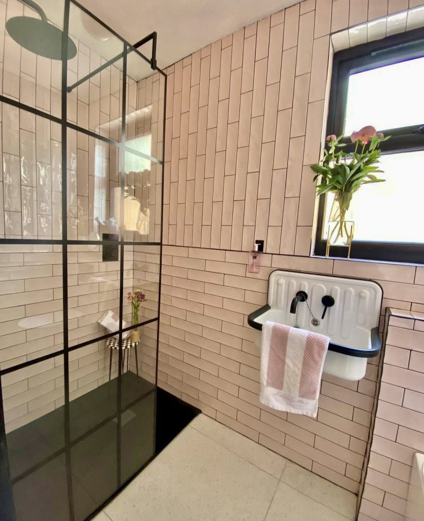 This guest bathroom gets a cute, trendy look with a blush pink tile that contrasts with heavy black elements. Steel-framed glass showers with this design give them a trendy industrial note with a visually lightweight look. The compact wall-mounted sink demonstrates that accommodating a tiny layout won’t mean losing that cute charm. Filling a room with small plants and lightweight textiles helps hard decorator elements in a room that’s both cute and decorator-balanced. It’s a stylish and sophisticated solution that feels new for 2026.