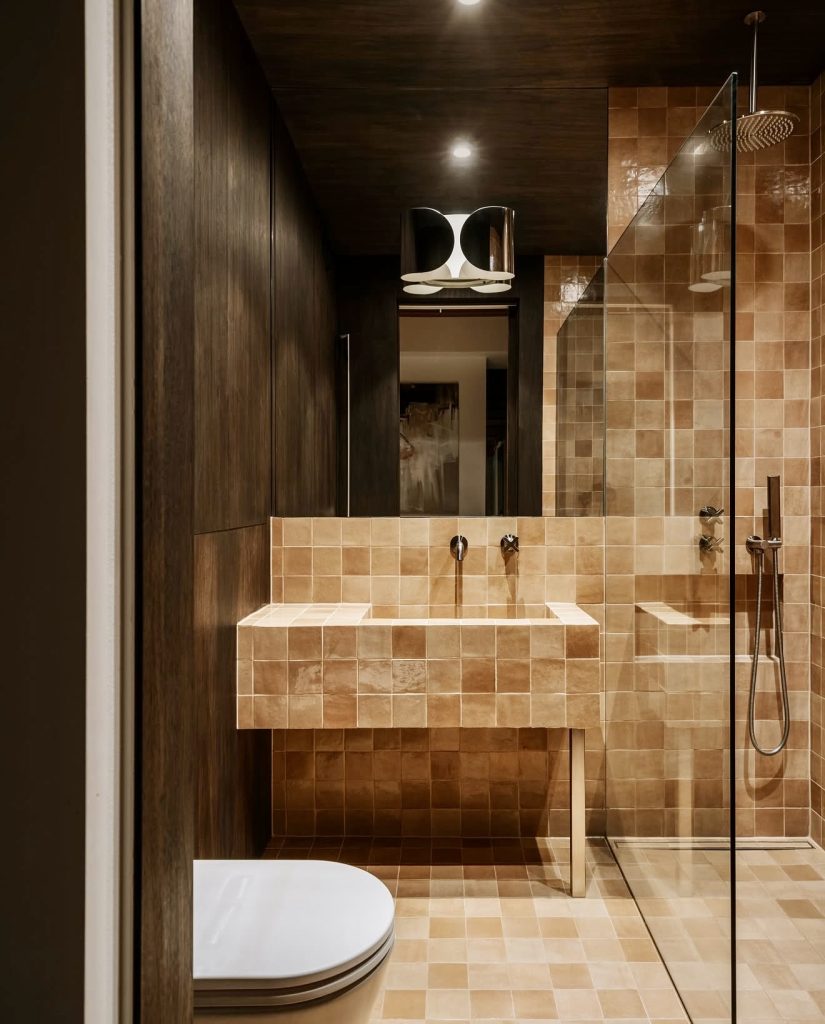 Warm terracotta tiles predominate this design, which produces a moody, earthy mood. The coordinating sink and shower walls seem classic and timeless, while dark wood elements create a sense of luxury. Black lighting and fixtures create a sophisticated modern edge with no loss of coziness. This look turns even a tiny guest bath into a spa-like retreat. It’s a great example of how earthy neutral colors look both fashionable and healing.