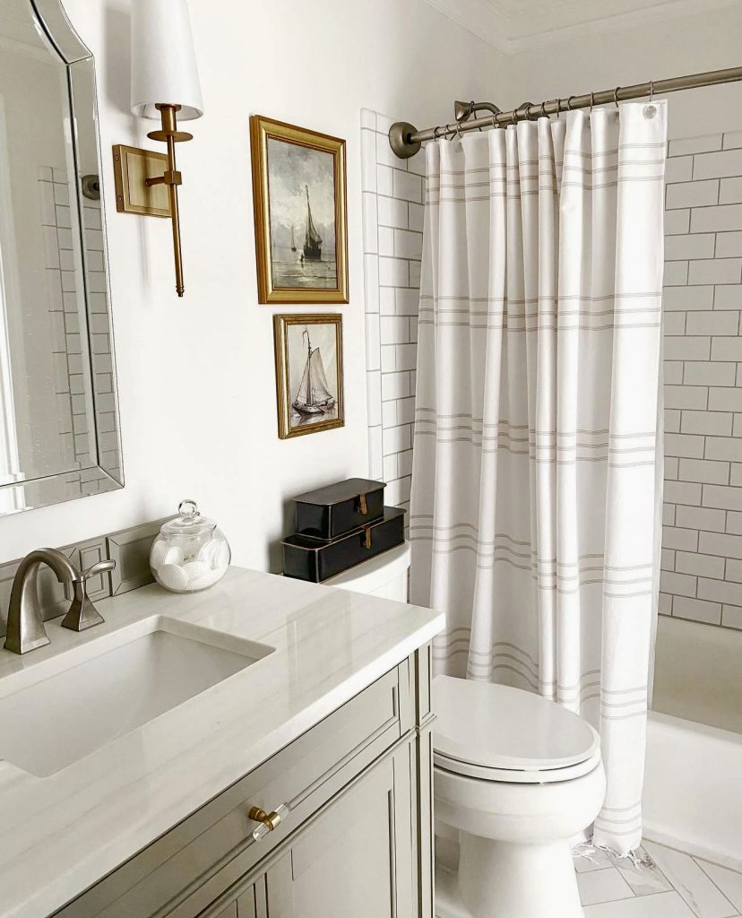 This bathroom goes for a classic coastal look with striped elements, white subway tile, and vintage prints. The wet tub layout keeps the configuration sensible for shared kids’ or apartment bathrooms. Subtle gold elements and framed prints skirt a more classic look but turn it more sophisticated. With black and white tones as a base, with soft neutrals, the room remains lightweight yet classic. It’s a cute but stylish-feeling guest bath that shows classic design will always come back in 2026.