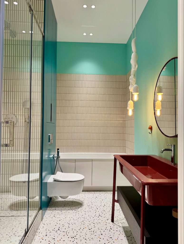 This guest bath adopts a fun design with a scoop of turquoise that gets a bold red vanity. A retro-inspired terrazzo floor adds vintage charm but leaves the room modern and hard-working, as it needs to be. A tub layout ensures versatility, which won’t necessarily go out of style in apartment settings or with shared kids. Playful lighting elements create a cute, whimsical, fun feeling, balancing bold hues. It’s an adventurous look at 2026 guest bathrooms, demonstrating how colors may enliven even a small room.