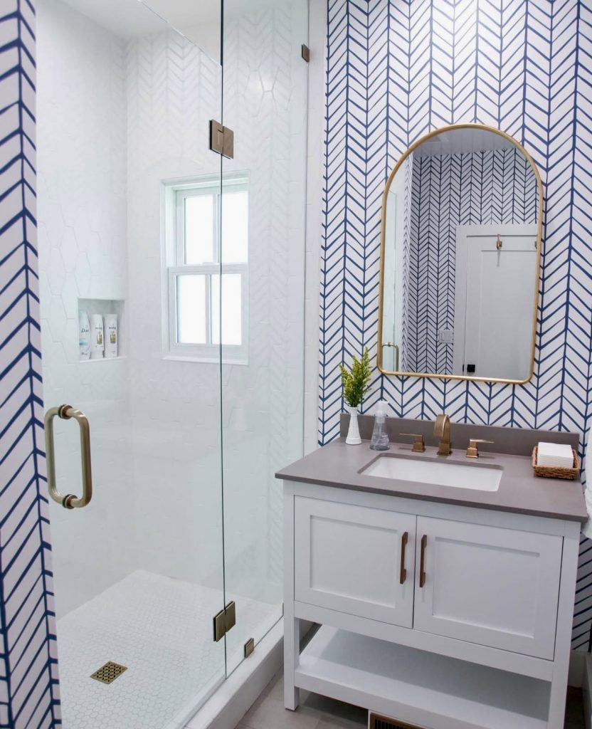 This bathroom emphasizes the influence of blue and white patterns, presenting a fresh, classic look that’s invigorating. A glass shower with brass hardware adds refined modern elements without losing brightness. The chevron wall detail provides fun personality that won’t overwhelm a small space. A single-sink vanity keeps it practical for guests but still fashionable. This is a look that’s effective in both minuscule and full guest bathrooms, thanks to a combination of persona and minimalism.