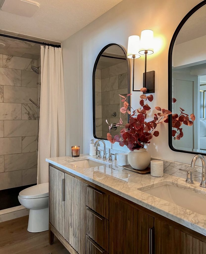 Here, a warm wood vanity with marble counters produces a classic guest bath with old-aid charm. A double sink configuration ensures practicality for shared youngsters or couples in a guest context. Ambient lighting and fresh greenery create inviting decorating elements, with neutral tiles serving as a sophisticated background. The tub and shower combination assures flexibility for adults as well as youngsters. It’s a high-style farmhouse look that blends warm, functional, high-end elements.