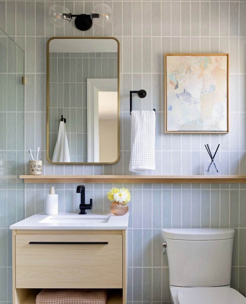 This proves that a guest bathroom needs to be fun as well as fashionable at the same time. With vertical tile lines that get a muted blue, there’s a modern fresh look that’s not overwhelming. With a light wood vanity with a single sink, it gets a balance, but with a black faucet, it gets a modern twist. With small elements such as a framed painting as well as flowers, it keeps it a lively, inviting decor. It’s a great option for a small or apartment bathroom where fun colors combine with functionality.