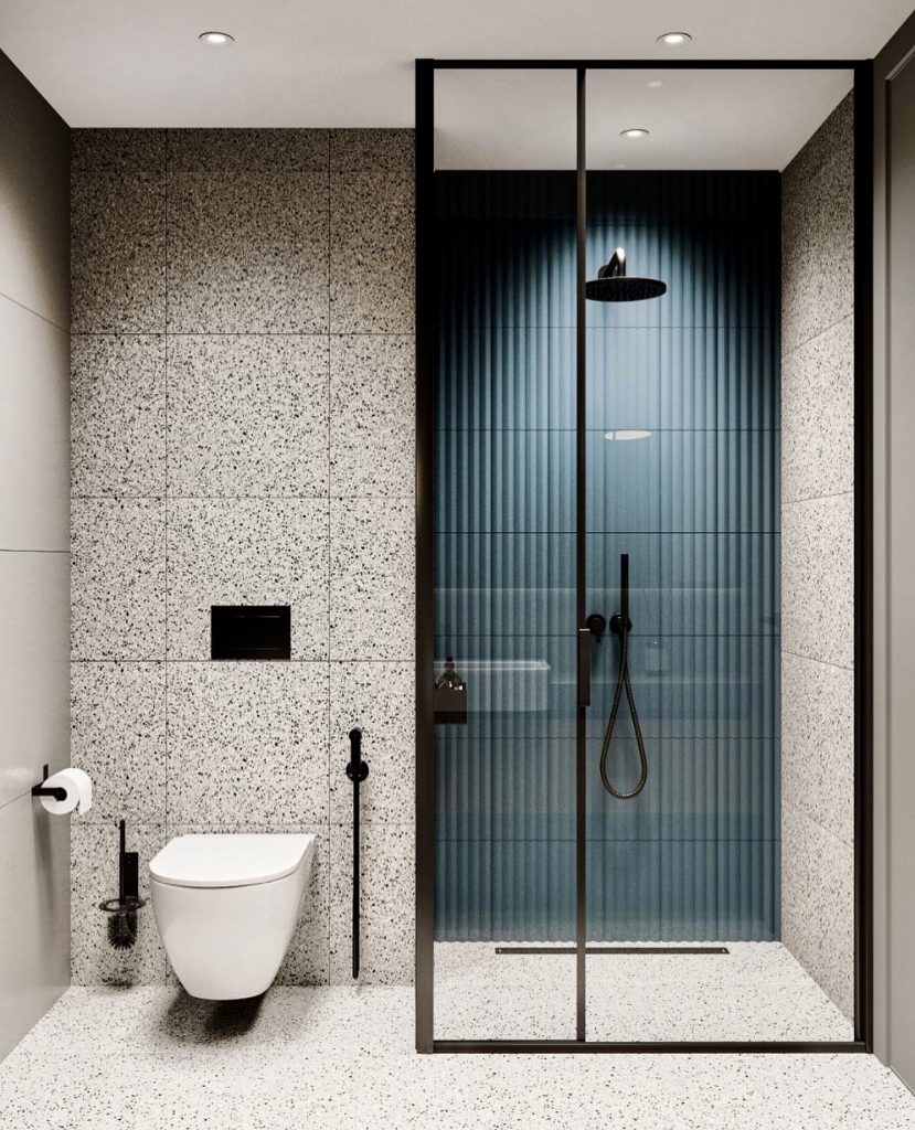 This 2026 guest bathroom goes for neutral serenity with speckled terrazzo floors with a high-gloss sheen and smooth blue-tiled walls. It’s a spa environment for a walk-in shower, with minimalist black elements that project a high-mod look with a point to make. A wall-mounted toilet defines a free-flowing, spacious room, ideal for minuscule apartments, which keeps it airy as well as uncluttered. Its palette seems sophisticated yet hard-wearing as well as a breeze to maintain. It’s a 2026 concept that demonstrates that it’s perfectly possible for simple to be appreciated as peaceful luxury.