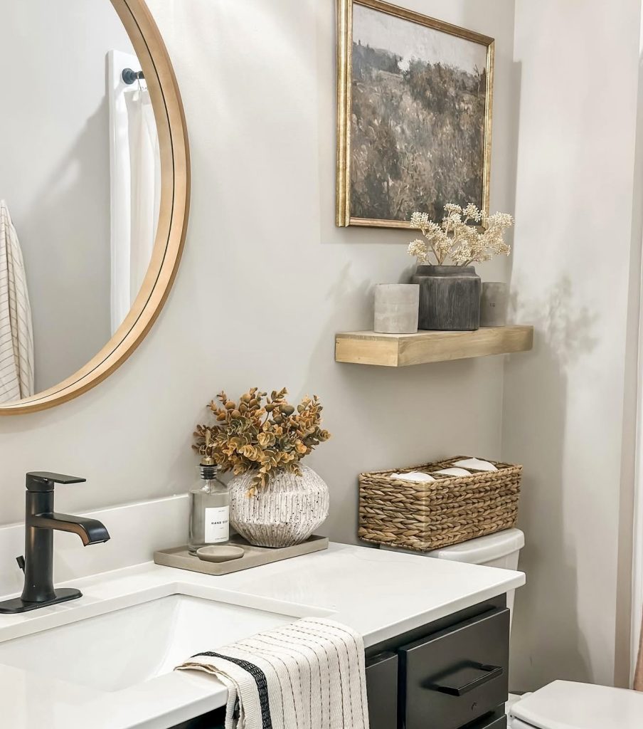 This bathroom adopts a modern minimalist aesthetic with minimalist wood. The floating vanity with a vessel sink feels both timelessly classic as well as elegant, with black fixtures adding a moody tone. With a pared-back color palette of neutral hues, this room feels spa-like as well as calm. Little added accoutrements, such as the sculptural vase as well as rolled towels, add drama to the decor without overcrowding. It’s a fabulous 2026 inspiration for a small guest bath that seeks to really feel expansive yet refined.
