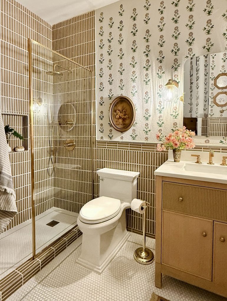 For individuals who love personality, this bathroom incorporates wallpaper and patterned flooring for a fun look. A large walk-in shower replaces a shower tub combo here, surrounded by shiny brass features that hint at luxury. Vintage prints as well as floral patterns create a fun yet classic ambiance. A wood vanity anchors the room with a sense of coziness, with pink flowers as a cute finishing note. It’s a bold design, ideal for someone who’d like a Bloxburg-style dream build-unique ambiance for a guest bath.