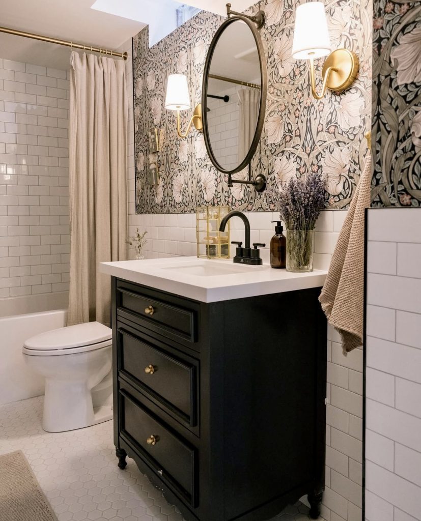 Bold wallpaper pairs with a high-gloss black vanity in this bathroom for a look that appears both classic as it is contemporary. A shower tub combo keeps it convenient for a guest while patterned walls inject a sense of fun as well as charm. Luxurious features such as lighting as well as fixtures in a brass tone add a hint of high-end look with a moodily floral background. It demonstrates that a small bathroom may be filled with charm with a certain combination of elements. For a small guest bath in an apartment, this style is both convenient as it is unforgettable.