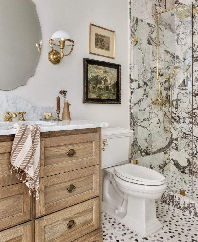 Natural wood drawers alongside a marble vanity top create a modern classic equilibrium here. A sensational marble clad shower stands out with a modern classic look that elevates a room with sophistication. Golden features unify the layout, giving a subtle luxury look to a guest bath. Framed pieces of artwork make the room seem thoughtfully curated, a timelessly calm sanctuary as opposed to a fully utilitarian space. It’s a great example of a spa-like look that still manages to maintain a warm, cozy feeling.