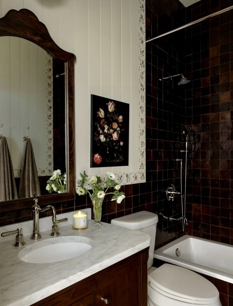 This bathroom embodies moody style with its dark rich tile, complemented with a classic wood vanity. A with tub configuration keeps it flexible, ideal for families with shared child spaces. Floral artwork and fresh flowers tone down the mood, cute decorating flourishes that balance out the dramatic color palette. Silver fixtures give it a timelessly classic look, ensuring the room avoids being too heavy or dark. It’s an overall vintage charm-influenced look with a farmhouse modern twist.