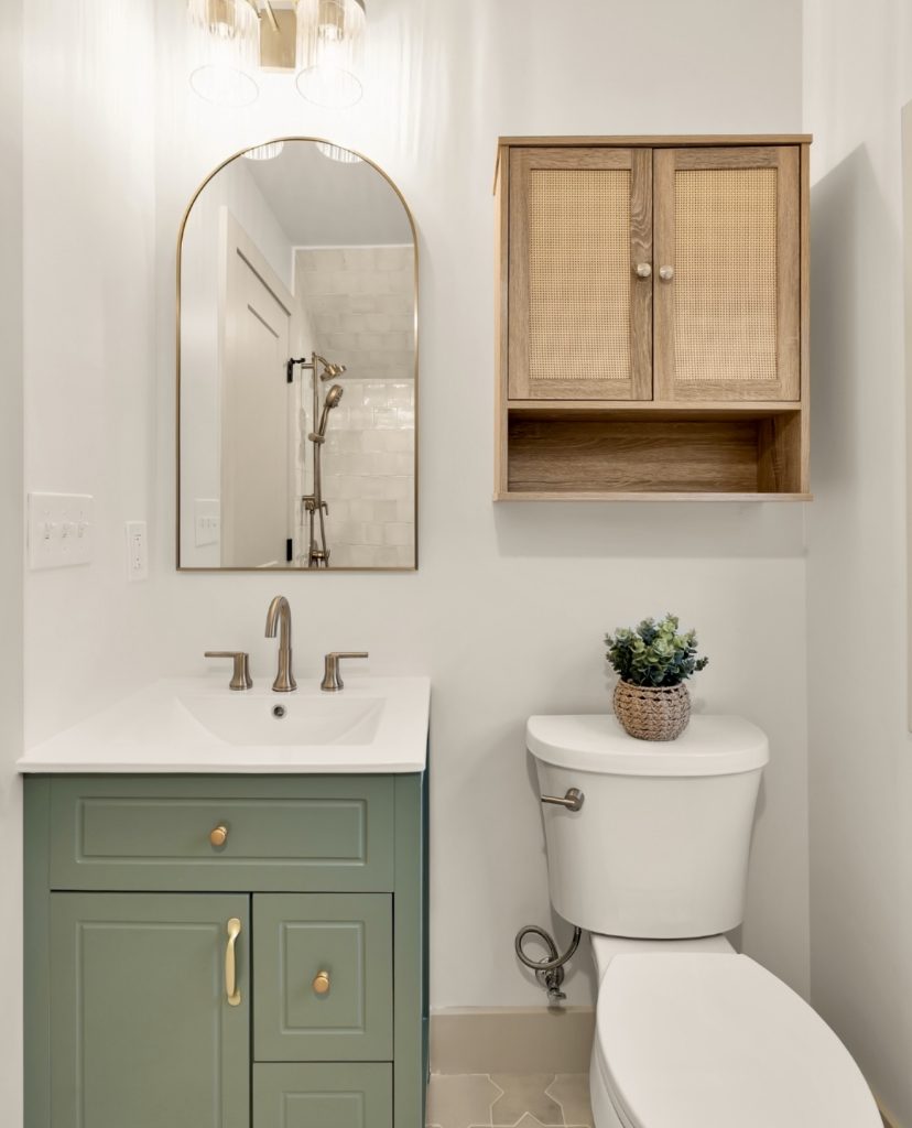 Minimalism shines in this small bathroom, where a green vanity paints a pop of personality across a blank canvas. This small single-sink configuration excels in an apartment or small guest bath. A wooden cabinet adds texture with a warm, decorating dimension that warms the room but avoids overcrowding it. The arched mirror adds a bit of designer-raffle high style that keeps it sleek yet modern. This style demonstrates that even the smallest of all guest bathsneedn’t just look cute but cute, functional, and fashionable for 2026.