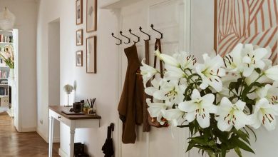 This hallway leans into a curated trending aesthetic, mixing an ochre black door, dusty pink accents, and sky blue trim in a way that feels both eclectic and deliberate. Contrast and repetition of the colors is the basis that is used in the design that does not incorporate dominance of one color. Layer art, a floral piece and a soft geometric rug complete this artistic layered effect. It is ideal in older houses where a display in the hall or through the hall is creatively a blank canvas.
