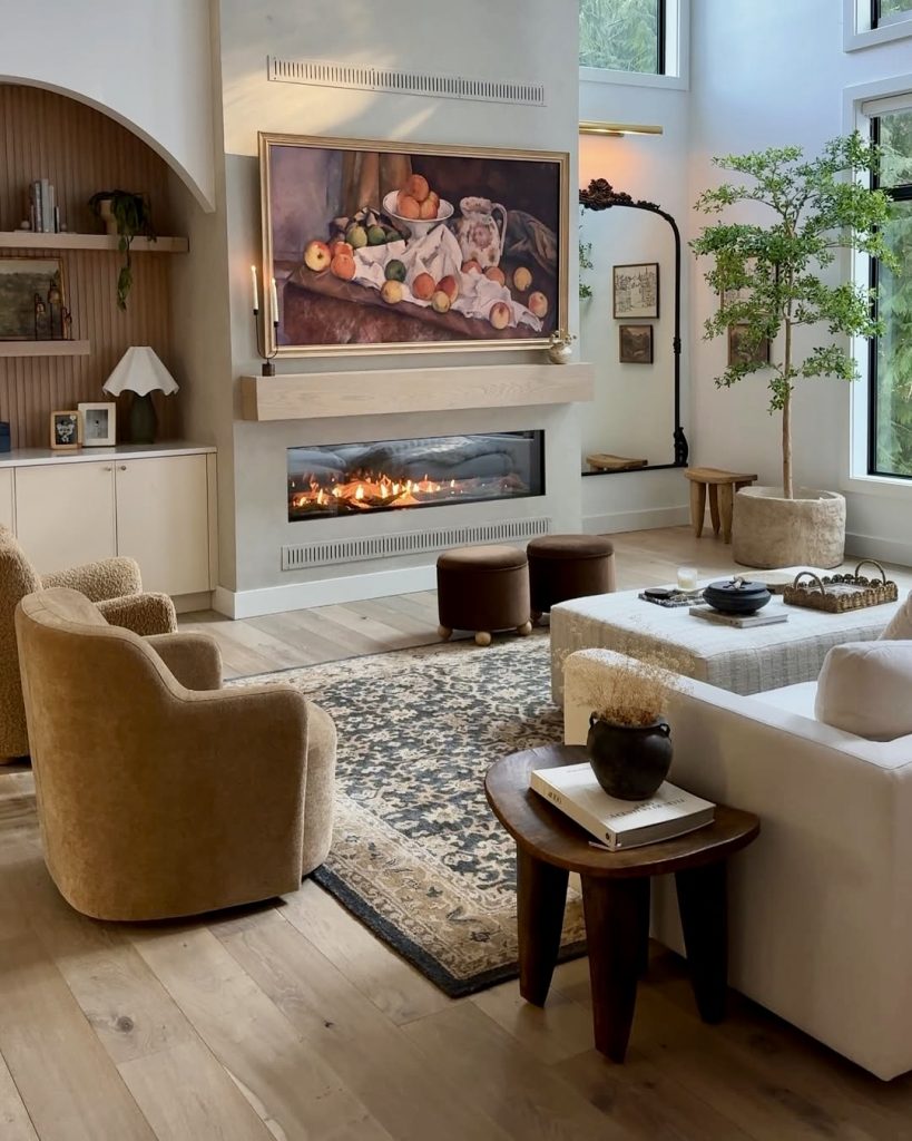 The earthy colors and modern details in this place really create a rustic but modern experience. Below an attractive still-life painting is a fireplace that provides both practical warmth and broadens the space’s charm. This design fits a home created or raised in a factory, merging several textures and bringing a feeling of calm. Floor-to-ceiling windows ensure natural light balances the heavier tones. The feeling of being home is there every time, on holidays or in the evening.”