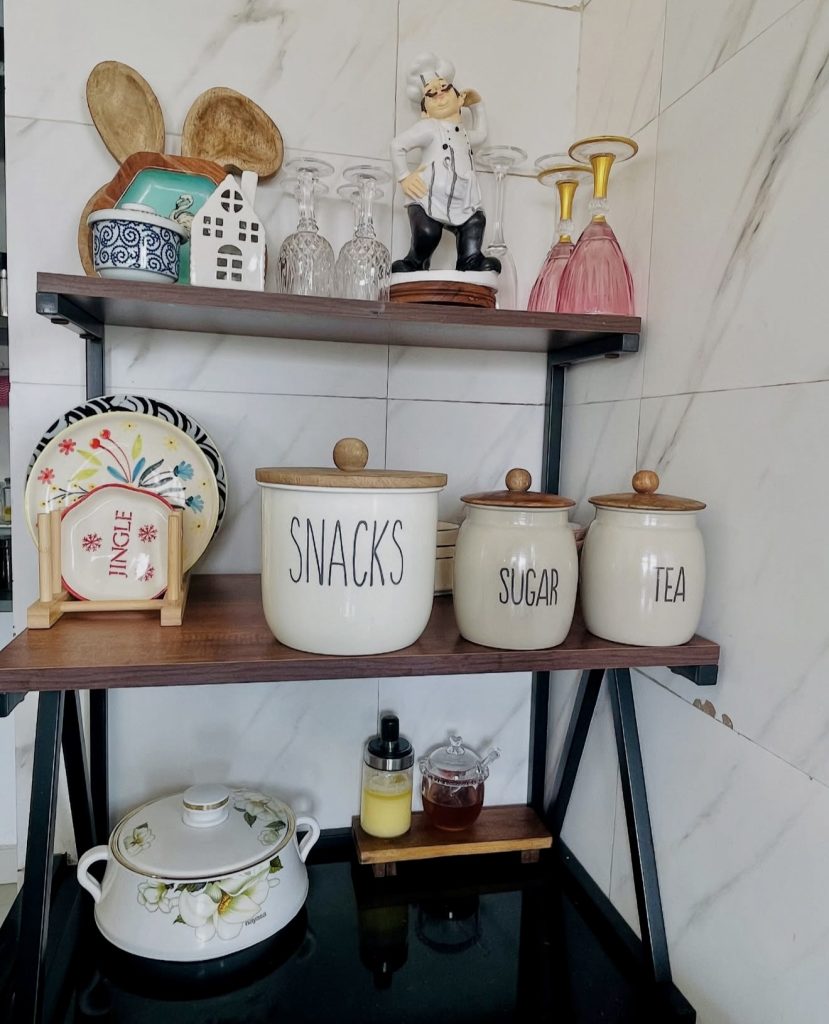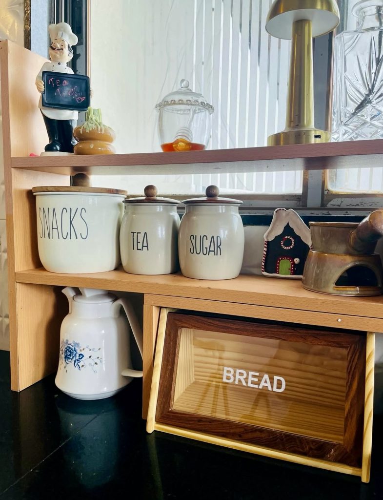 This countertop brings together storage and charm with a mix of labeled canisters, a lamp, and a wooden bread box—all arranged neatly on a compact shelving stand. The setup is perfect for small spaces, where vertical storage becomes essential without sacrificing style. The chef figurine adds a fun, cute touch, softening the otherwise minimalist cream-and-wood palette. What makes this vignette work so well is its practicality: everything you reach for daily—tea, snacks, sugar—is right at hand, yet the arrangement feels warm and homey.