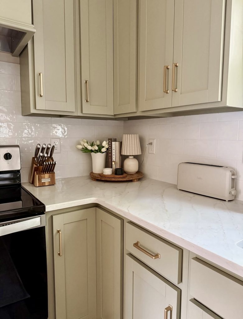 This countertop embraces the warm, understated style that’s trending heavily in 2026—especially in homes choosing soft sage or muted neutrals. The small round tray creates a perfect corner vignette with a compact lamp, a few curated books, and a ceramic vase of tulips. It’s a great example of how to introduce a lamp into kitchen styling, a technique many designers say adds instant coziness, especially in the early morning or during quiet evening cooking sessions. The mix of matte textures, brass hardware, and white marble-look counters strikes a beautifully elegant balance that feels modern without losing warmth.