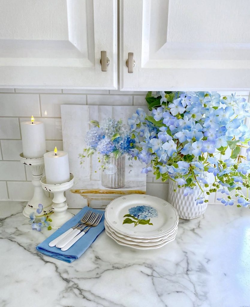 This arrangement is all about charm and seasonal beauty. The white marble countertop provides a cool backdrop for a soft palette of blues and whites, from hydrangea-patterned plates to the overflowing floral arrangement that feels delightfully cute. Candles on distressed stands add a delicate, vintage-inspired glow—ideal for spring brunches or Christmas hostess setups. This style works especially well for homeowners who enjoy rotating décor with the seasons, keeping things fresh while still maintaining a clean, airy aesthetic. It’s proof that even simple plate stacks can become part of your decorative storytelling.