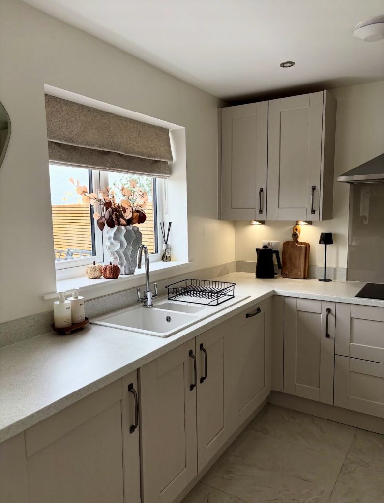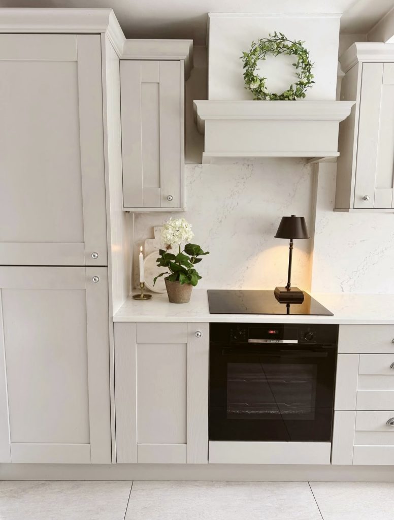 This neutral kitchen embraces a calming palette that feels both modern and inviting. The countertop décor is subtle—just a sculptural vase filled with soft autumn-colored stems, a small fragrance diffuser, and neatly arranged essentials near the sink. This understated approach aligns with minimalist ideas, showing how a few well-chosen items can define the space without overwhelming it. The look is especially well-suited for corner countertops, where clutter easily accumulates. With warm lighting and clean finishes, the result is a gentle, soothing space ideal for everyday living.
