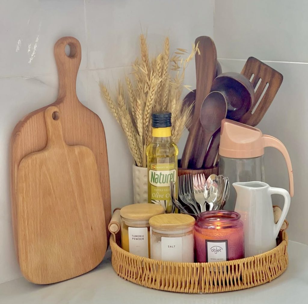This countertop captures a cozy, lived-in look with warm wood boards, a woven tray, and everyday essentials arranged neatly together. The inclusion of spices like turmeric subtly hints at Indian influences, making the vignette feel personal and culturally grounded. The wooden utensils, olive oil bottle, and ceramic pitcher show how to style a corner in a way that’s equal parts functional and decorative. Even the lit candle adds a soft glow, making the space ideal for early-morning coffee or peaceful evening cooking. It’s a beautiful example of merging ideas of Indian warmth with modern practicality.