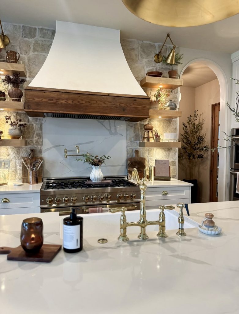 This luxurious countertop setup blends rustic charm with refined detailing—a combination highly sought after in 2026 kitchens. The stone wall, open shelves, and oversized range hood create a striking backdrop, while brass faucets and accents bring in a classic elegant tone. The countertop remains intentionally simple: a dark glass candle, a bottle of soap, and a small dish brush keep the surface tidy yet stylish. This arrangement suits homeowners who prefer ideas for modern farmhouse or European-inspired spaces, where the materials—stone, brass, and wood—tell the story. The overall look feels curated, warm, and undeniably high-end.