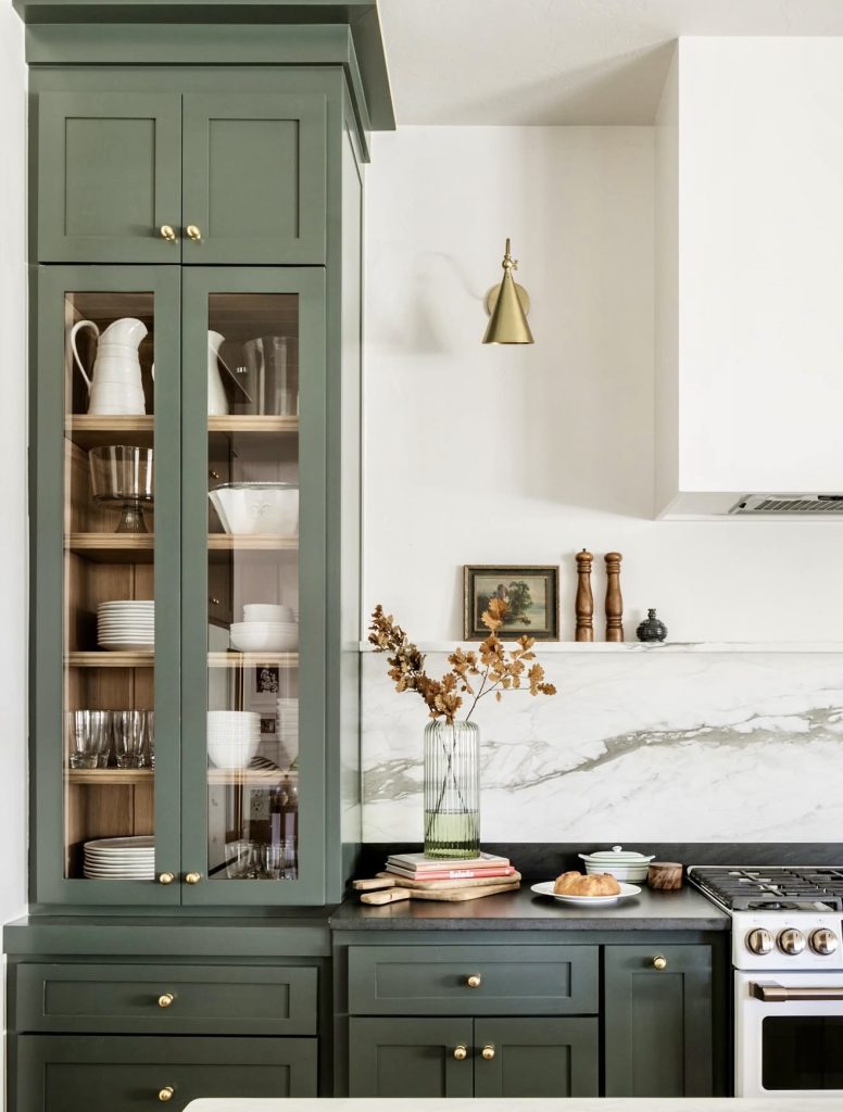 16. Deep Green Cabinetry With Warm brass & Marble Accents